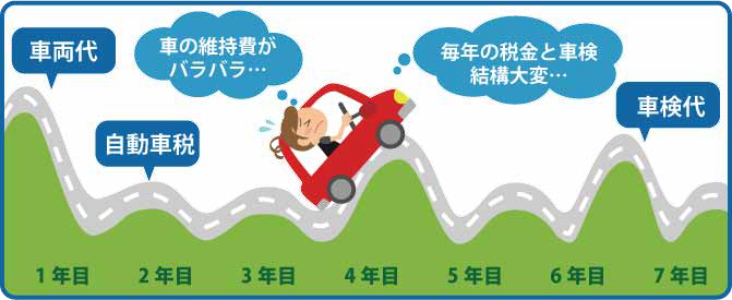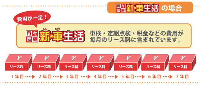 【新☆車生活】は7年間にかかる税金、自賠責保険、車検及び点検、諸経費、消耗部品交換などが全てコミコミです。