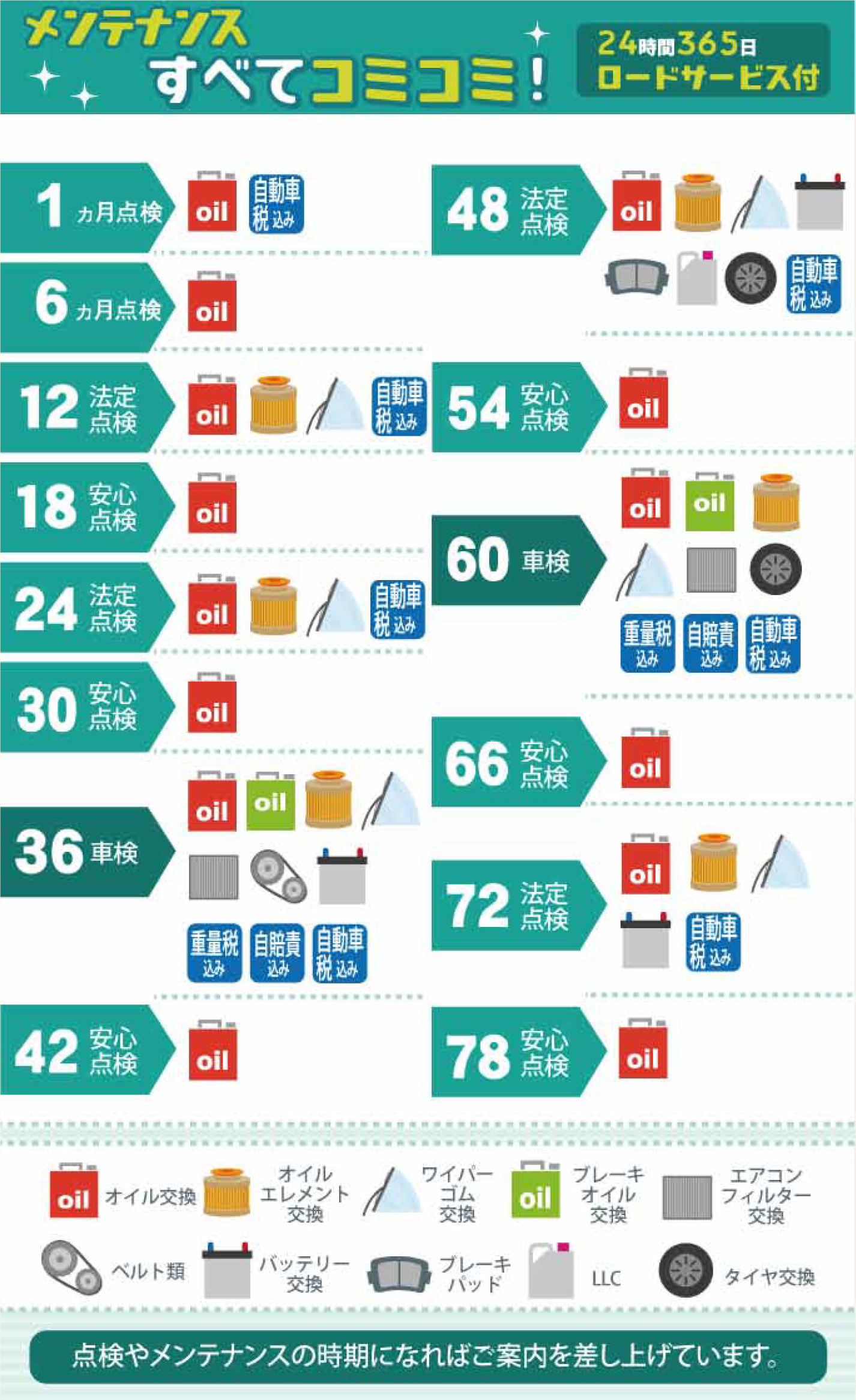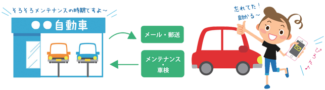 オイル交換、点検、車検の時期が来たら、ご案内をお届けしますので、お客様は安心して快適に、お車に乗るだけ!という仕組みです。